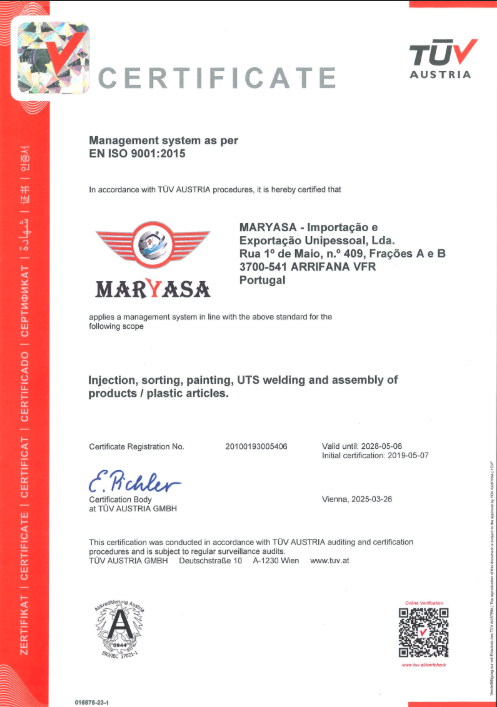 Maryasa's current products are: injection mold design; alteration, maintenance and repair of molds; injection mold testing; injection and assembly of plastic parts; manufacturing of plastic items: injection of pre-series and production series; product assembly services including painting and welding processes.